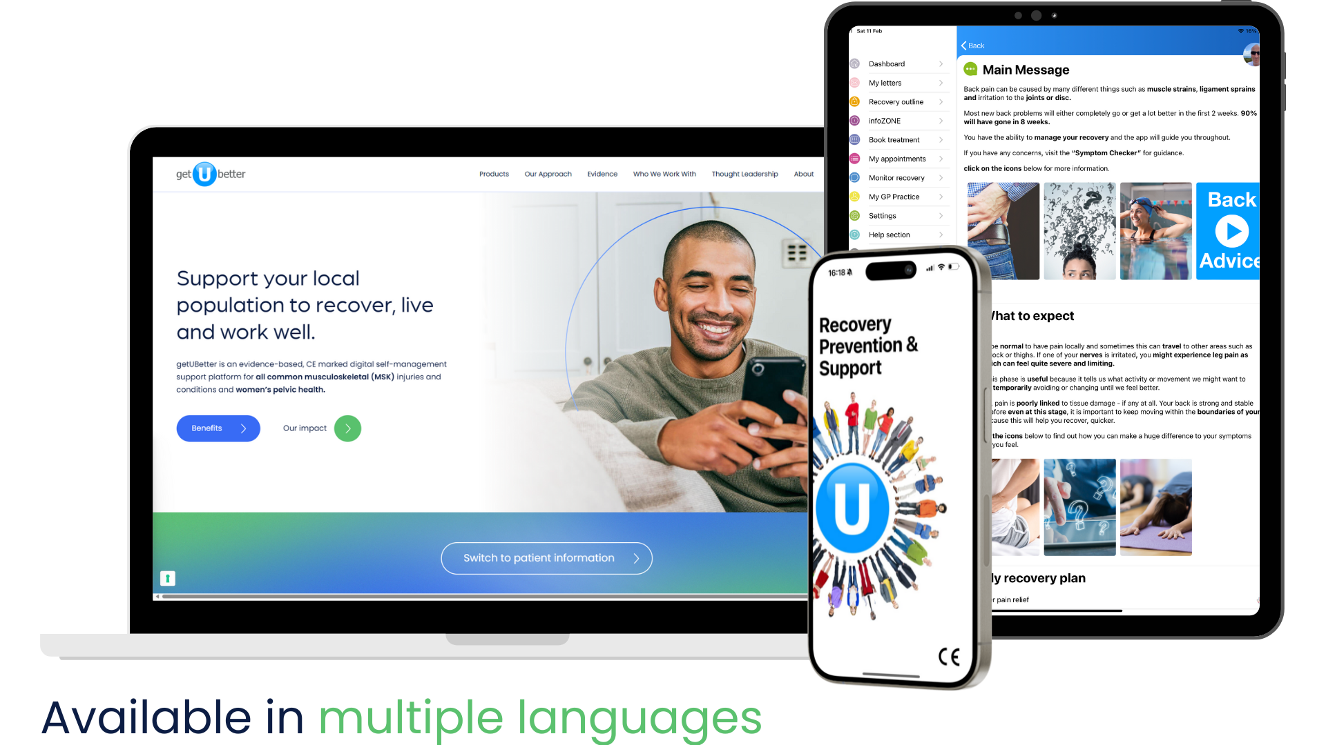 getUBetter is an evidence-based, CE marked, digital self-management platform for all common MSK injuries and conditions as well as women’s pelvic health. The platform currently supports 40% of the NHS in England. It is available across 17 integrated care systems (ICSs) to a total eligible population of over 20 million people.