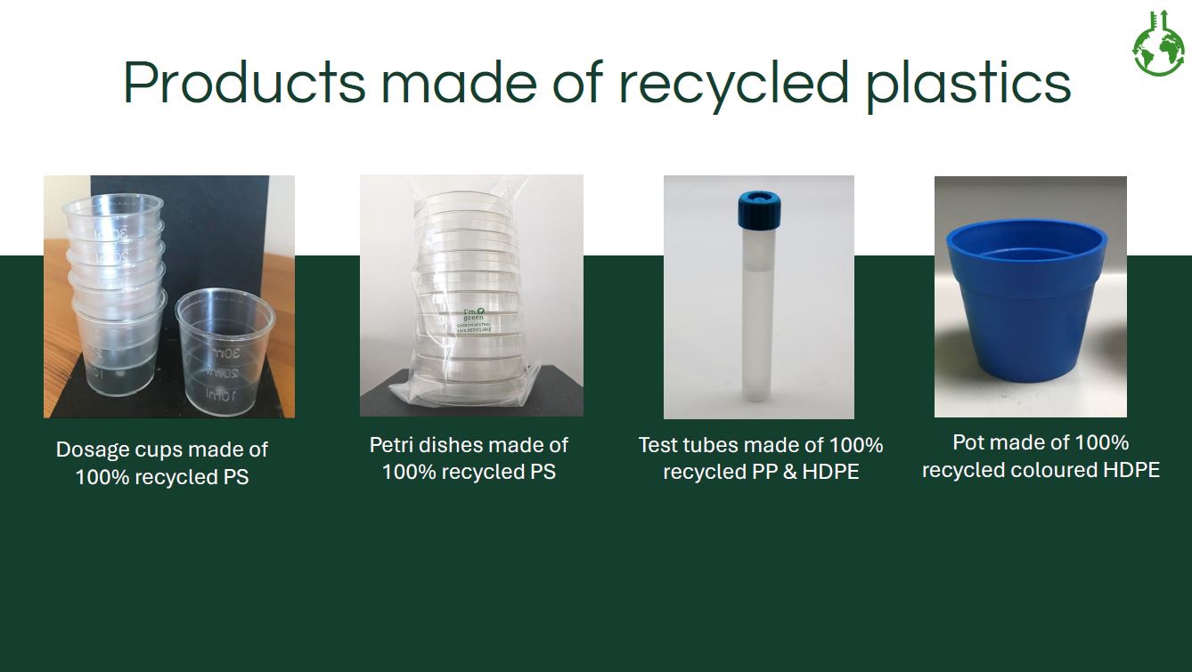 Following polymer characterisation, test tubes, dosage cups and petri dishes have been made from 100% recycled plastics. The products were tested by third party to ensure they meet requirements of sterility, endotoxin and extractables. Lab testing data show the performance of the recycled products is similar to virgin plastic counterparts.