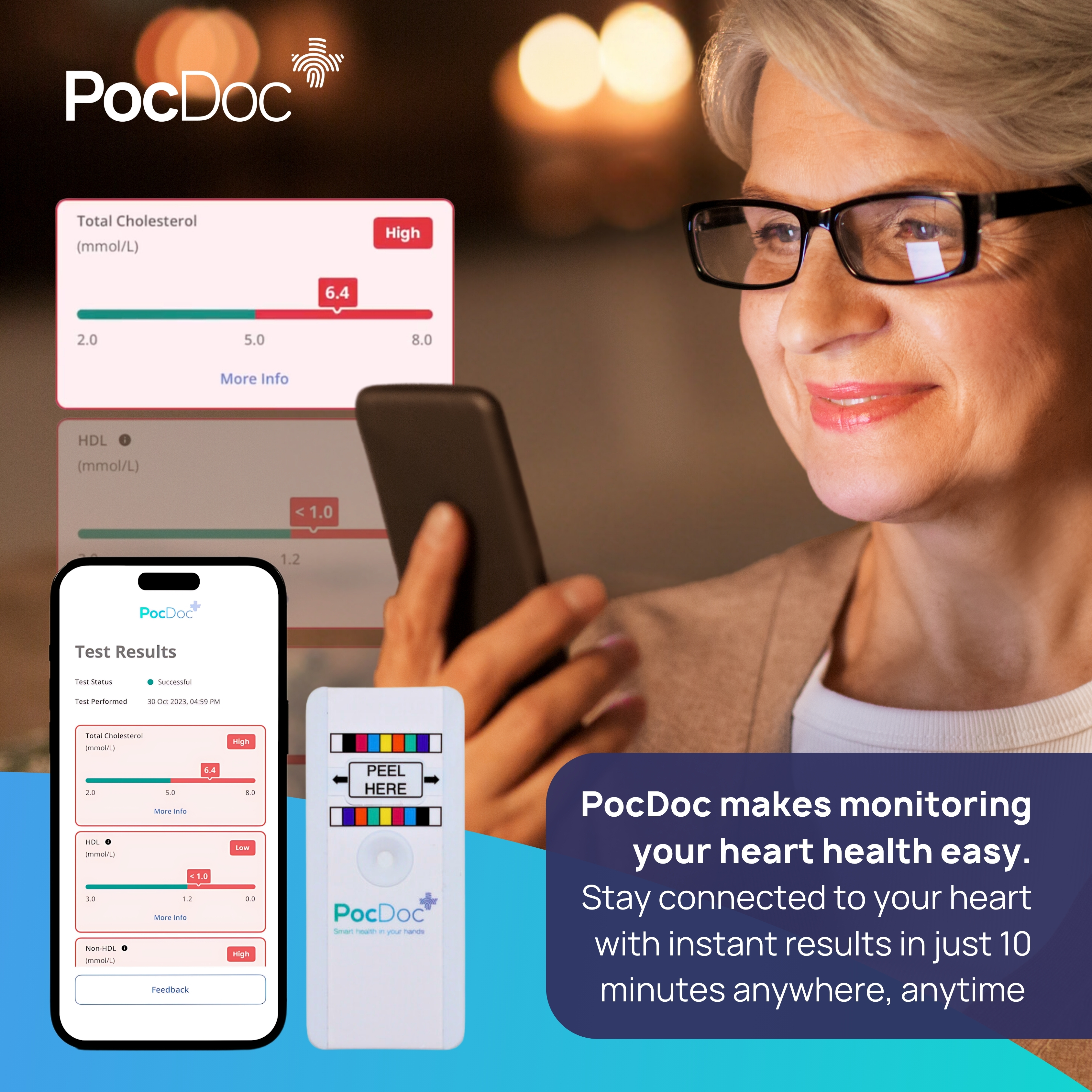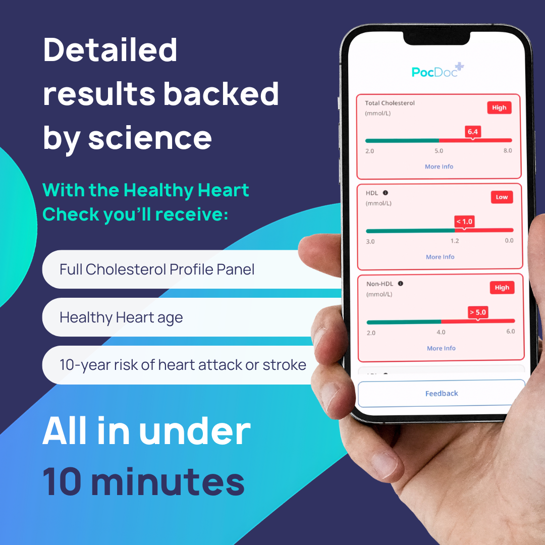 The PocDoc Healthy Heart Check enables users to discover their heart health in under 10 minutes, including a full lipid panel, Heart Age and 10 year risk of heart attack/stroke. The fully