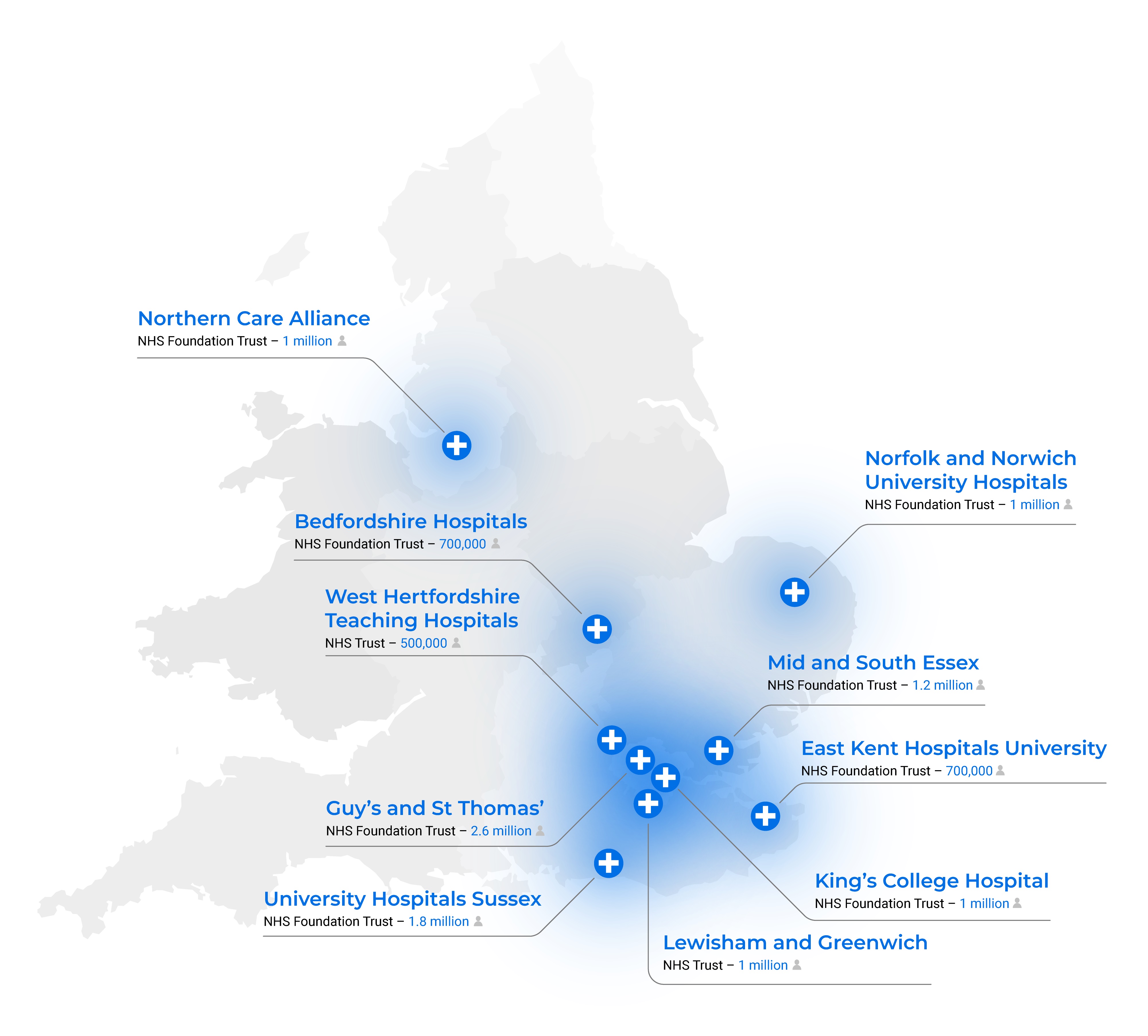 • eDerma currently serves 8.8 million individuals over 10 care organisations: East Kent Hospitals University NHS Foundation Trust, University Hospitals Sussex NHS Foundation Trust, Northern Care Alliance NHS Foundation Trust, Bedfordshire Hospitals NHS Foundation Trust, West Hertfordshire Teaching Hospitals NHS Trust, Mid and South Essex NHS Foundation Trust, Norfolk and Norwich University Hospitals NHS Foundation Trust, Guy’s and St Thomas’ NHS Foundation Trust, King’s College Hospital NHS Foundation Trust, Lewisham and Greenwich NHS Trust.